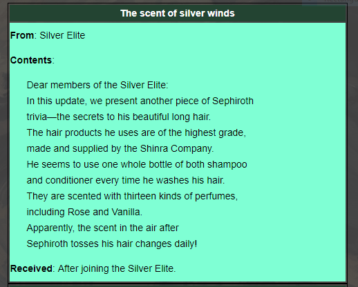 What's hilariously interesting is that in Crisis Core he has Paparazzi over him and has a fan club dedicated to his life style or something if I remember. A fan club girl member in Crisis Core found out that Sephiroth uses a whole bottle of shampoo. How they found out? no idea. There's three fan clubs that Zack can join in. Sephiroth, Angeal, and Genesis. Genesis actually has two fan clubs but he's the least most popular for obvious reasons. (Their reason for Genesis is that he can be an asshole towards people approaching him even from his fan clubs, my reason is that he's incredibly bipolar and incredibly lame.) He's there for the edgelords and emos put together but that's just me being generous on description.